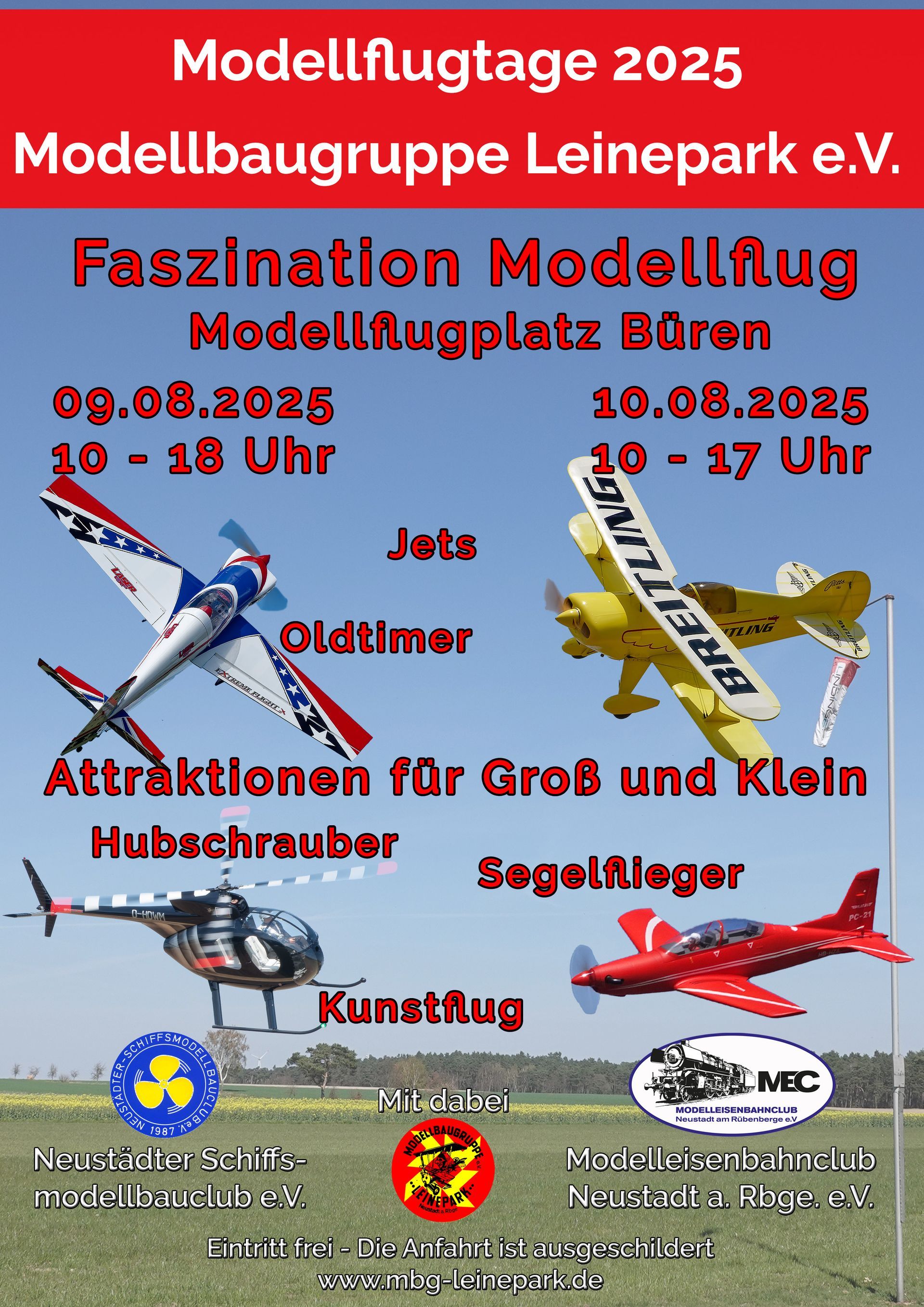 Bald ist es wieder soweit, dann finden unsere Modellflugtage statt. Am 09. und 10. August zeigen wir wieder was der Modellflug alles zu bieten hat. Aber auch der Modelleisenbahnclub Neustadt e.V. und der Neustädter Schiffsmodellbauclub e.V. präsentieren ihr interessantes Hobby.